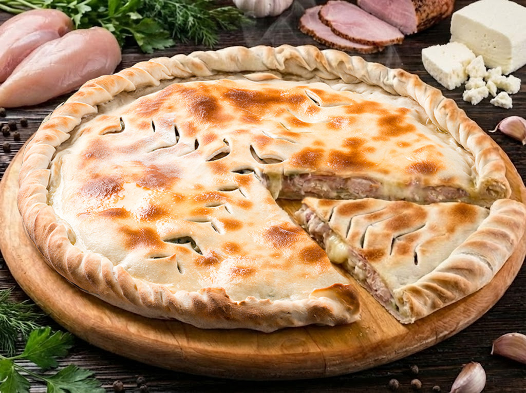Тесто в сочетании с сочным филе цыпленка, ароматной ветчиной и восхитительным крафтовым имеретинским сыром.
