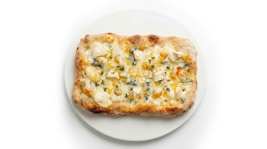 Тесто, сливочный соус, моцарелла, горгонзола, пармезан, фетакса и сливочный сыр.