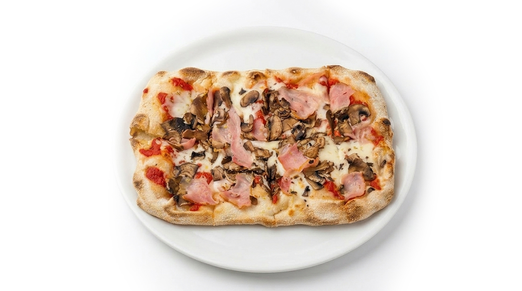Тесто, соус «Sugo del Papa», моцарелла, шампиньоны, бекон резаный, орегано.